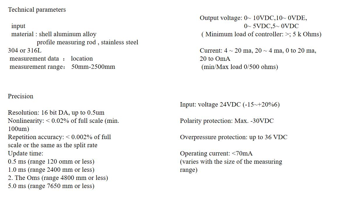 The TL series displacement sensor has a built-in 16-bit D/A converter, which can accurately convert the absolute position of the vernier magnetic ring into a standard 4-20mA current signal or 0-10V voltage signal in real time. The output signal has a linear relationship with the effective range. The zero point, full scale and positive and negative direction can be set 100% through a screwdriver according to the needs of site use, and the operation is simple. The output standard analog signal can be directly output to PLC control module (such as Siemens 331 module) or other instruments.?
