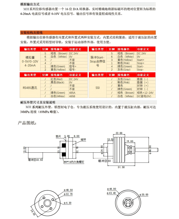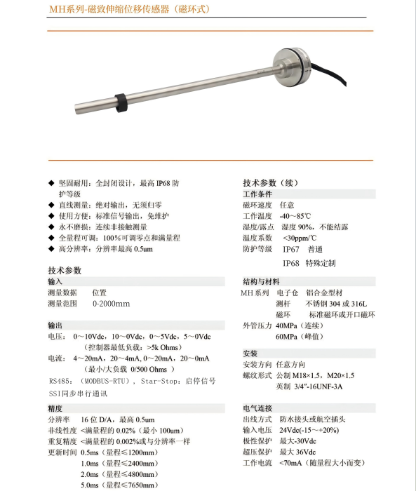 MH系列磁致伸縮位移傳感器 油缸內(nèi)置位移傳感器 磁環(huán)式 高精度